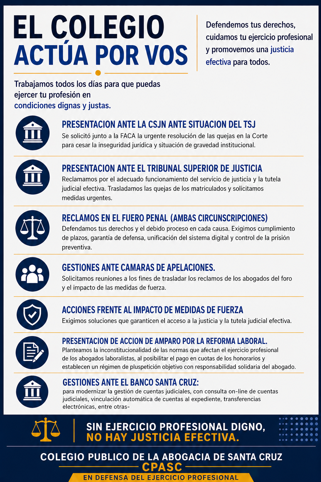 El Colegio Público de la Abogacía de Santa Cruz informa a sus matriculados que, en cumplimiento de las funciones conferidas por la Ley Provincial Nº 3913, se han impulsado diversas acciones institucionales frente a las afectaciones al ejercicio profesional derivadas del funcionamiento del servicio de justicia y de las medidas de fuerza del personal judicial.