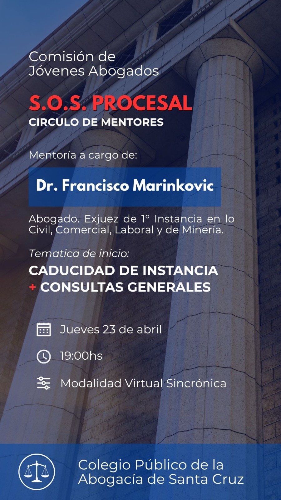 El Colegio Público de la Abogacía de Santa Cruz invita a todos los matriculados y matriculadas a ser protagonistas de este nuevo espacio: «SOS Procesal: Círculo de Mentores», iniciativa organizada desde la Comisión de Jóvenes Abogados, bajo la dirección del Dr. Agustín Paradelo y la Vicedirección del Dr. Nicolás García.